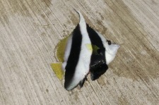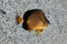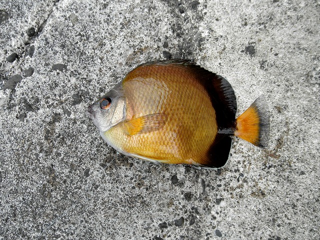 天気が良買ったが、少し海がうねっていた。堤防の先端で釣り出したら、タカノハダイが釣れた。その後、熱帯魚のような黄色い